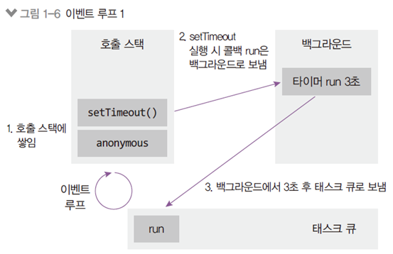 이벤트 루프: 이벤트 발생시 호출할 콜백 함수를 관리하고 등록된 콜백 함수의 실행 순서를 결정하는 역할
